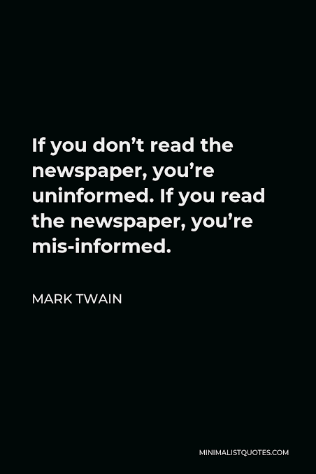 Quote If you don’t read the newspaper . . . If you don’t read the newspaper, you’re uniformed. If you read the newspaper, your mis-informed. Mark Twain. Share this:TweetShare on Tumblr Click to email a link to a friend (Opens in new window) Email Click to share on goodreads (Opens in new window) goodreads Click to share on Telegram (Opens in new window) Telegram More Click to print (Opens in new window) Print Pocket Click to share on Reddit (Opens in new window) Reddit Like Loading... Related