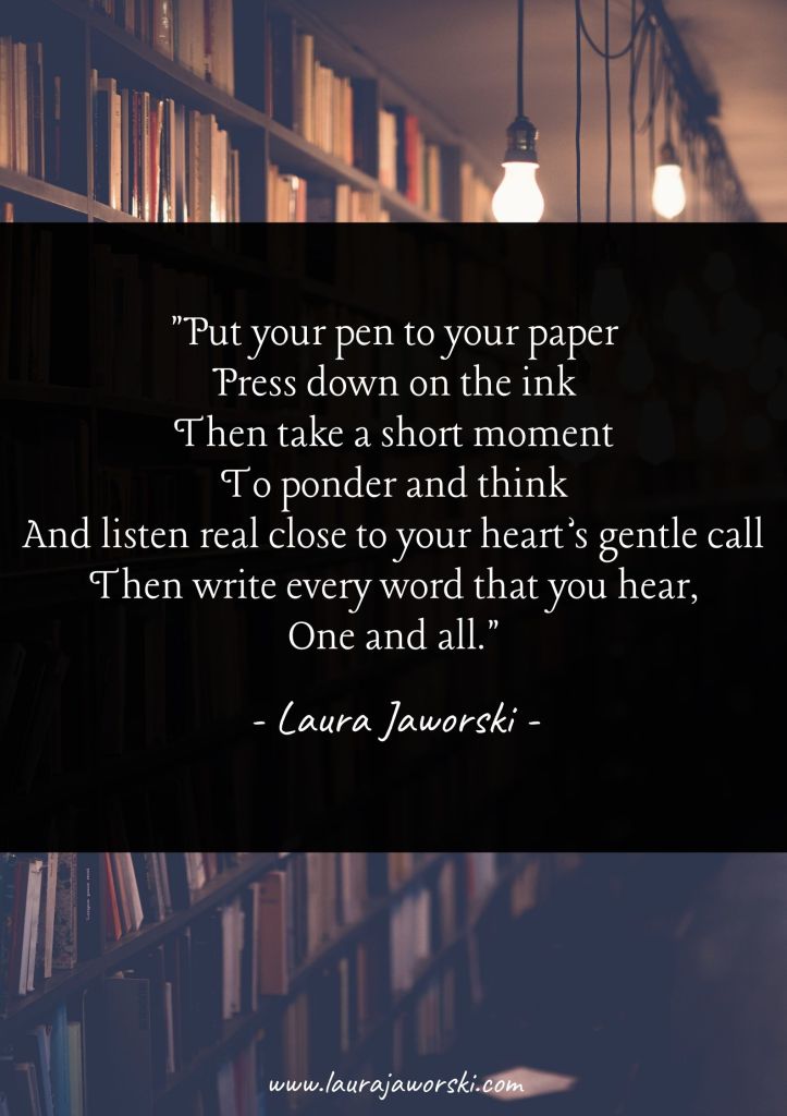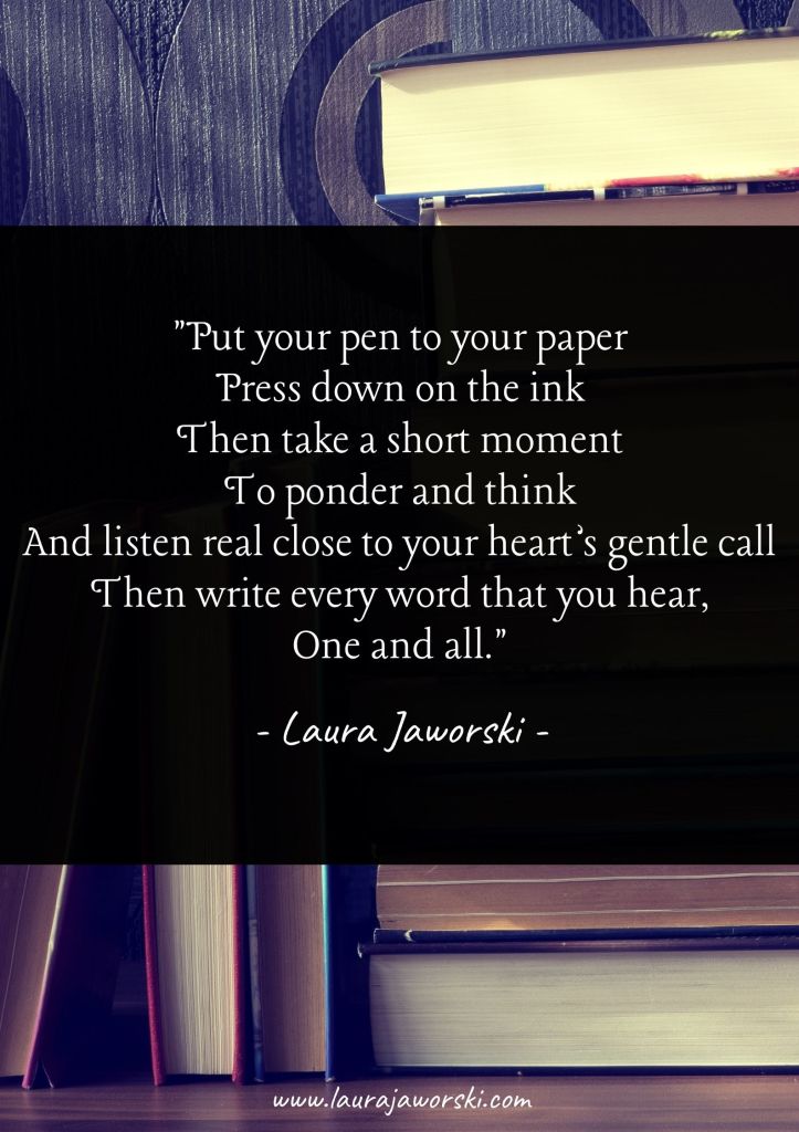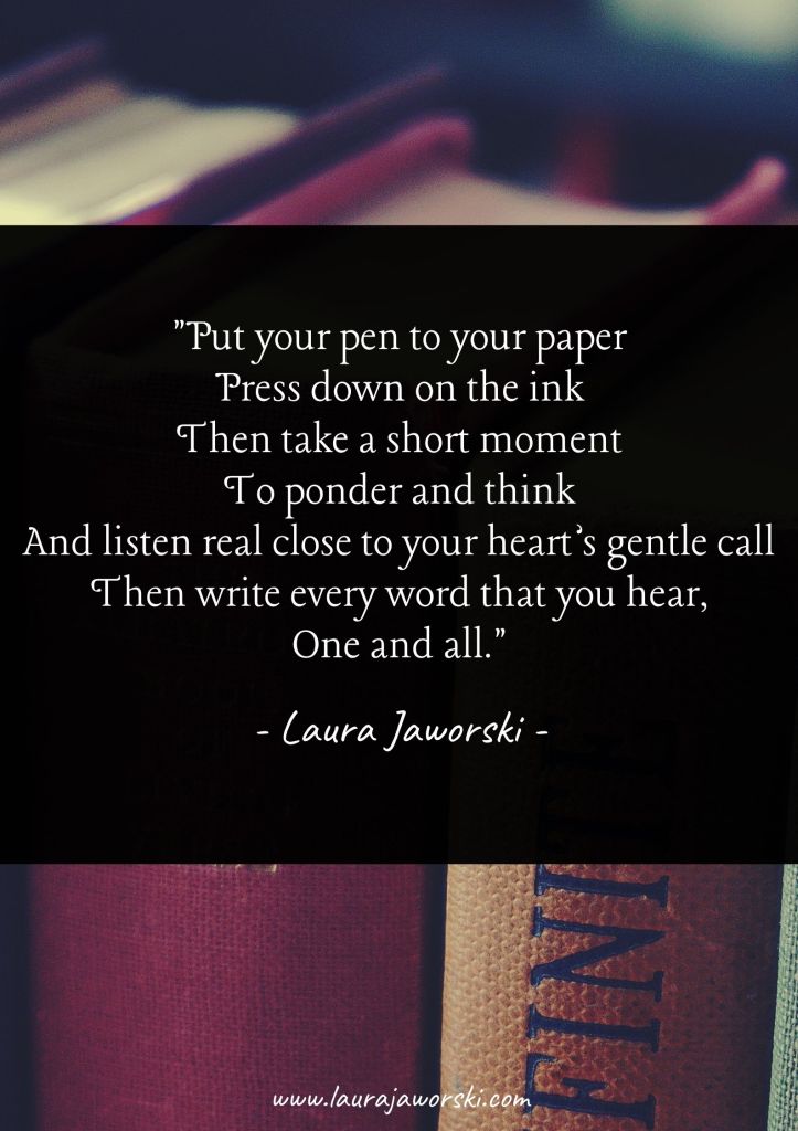 Your Heart’s Gentle Call by Laura Jaworski π Posted on October 8, 2021 by A.M. Simpson under motivation Bugburry Pond by Laura Jaworski βPut your pen to your paperPress down on the inkThen take a short momentTo ponder and thinkAnd listen real close to your heartβs gentle callThen write every word that you hear,One and all.β Laura Jaworski 60 Quotes About Art & Creativity β¨ View original postShare this:TweetShare on Tumblr Click to email a link to a friend (Opens in new window) Email Click to share on goodreads (Opens in new window) goodreads Click to share on Telegram (Opens in new window) Telegram More Click to print (Opens in new window) Print Pocket Click to share on Reddit (Opens in new window) Reddit Like Loading... Related