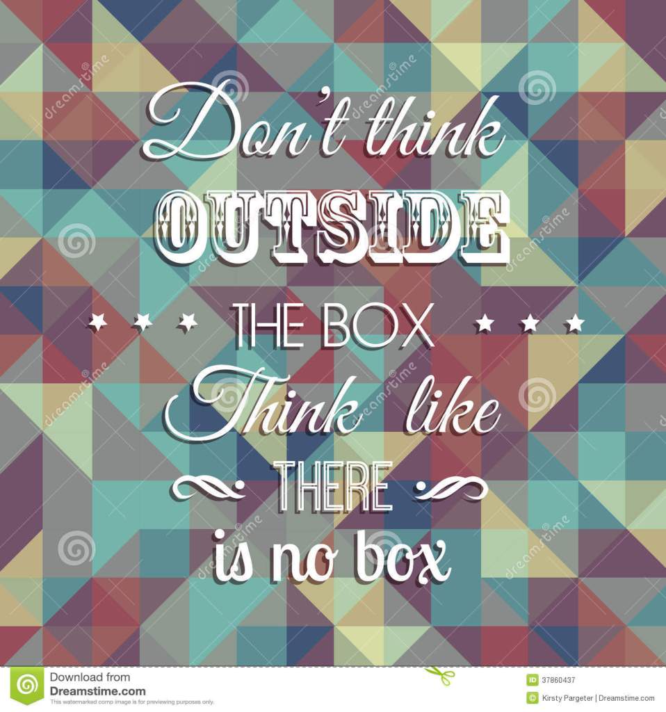 Quote Don’t think outside the box . . . Share this:TweetShare on Tumblr Click to email a link to a friend (Opens in new window) Email Click to share on goodreads (Opens in new window) goodreads Click to share on Telegram (Opens in new window) Telegram More Click to print (Opens in new window) Print Pocket Click to share on Reddit (Opens in new window) Reddit Like Loading... Related